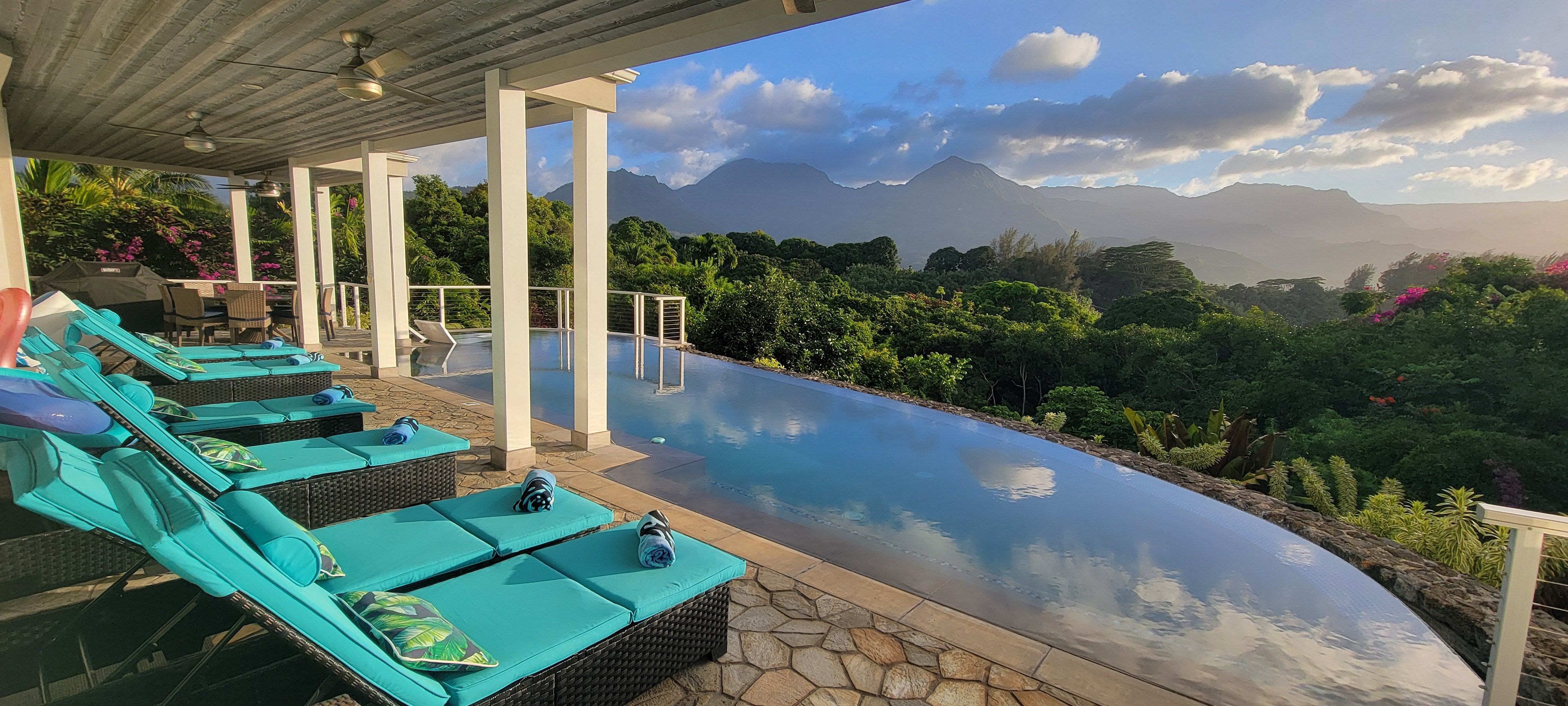 IMHO this gorgeous property has the best view of the island! View of the bluffs and Hanalei Bay is something spectacular. We came in sort of late when it was dark and quite literally gasped when folks woke up and saw the full view. We used the pool daily and it was amazing. The place was a gem and had everything we needed for our one week stay. It was the trip of a lifetime for our extended family. The huge main kitchen was used quite often to cook meals for the family. Highly recommend the property!