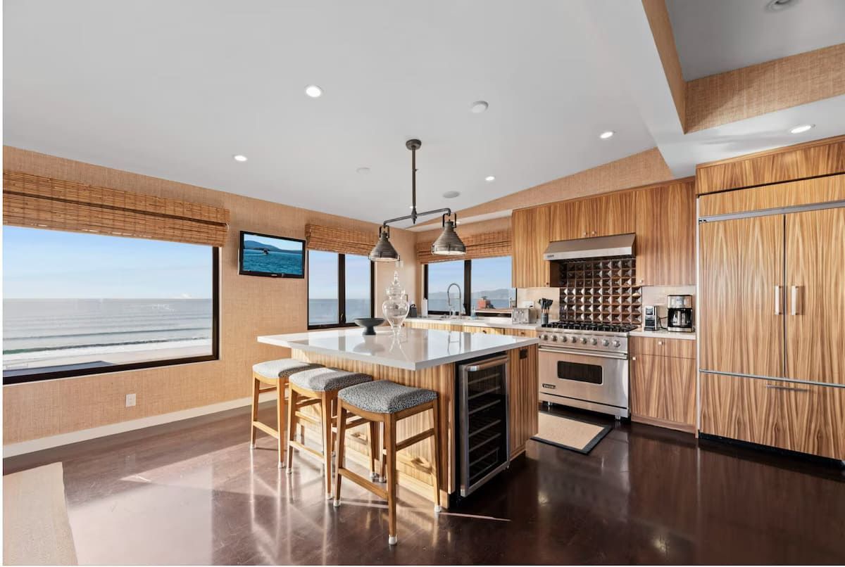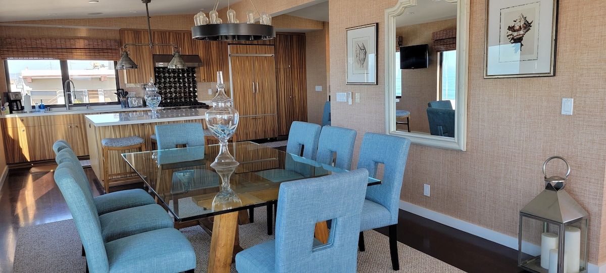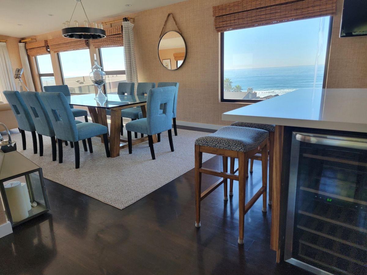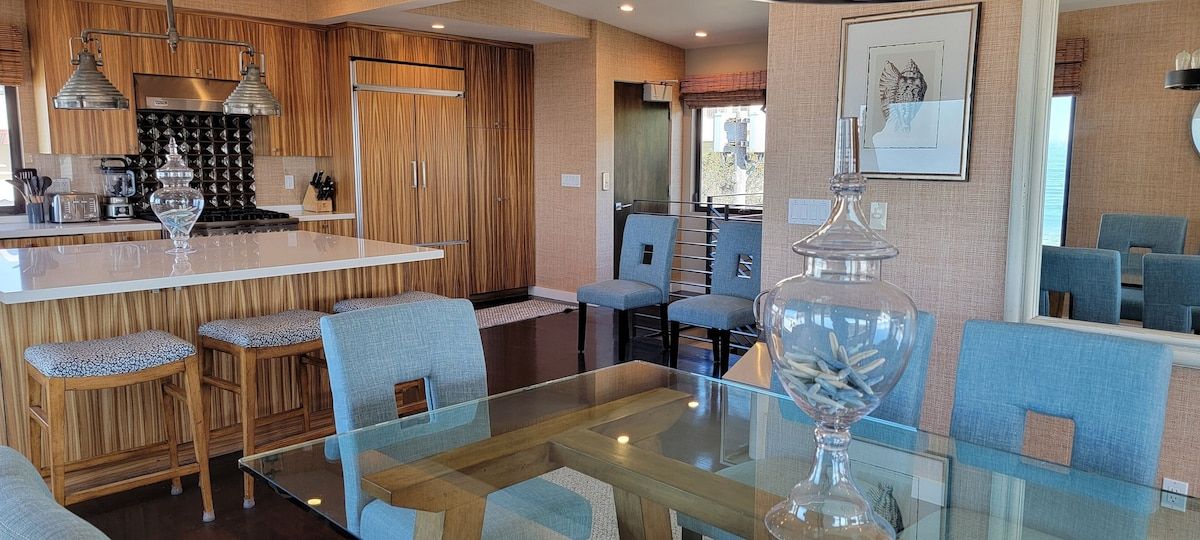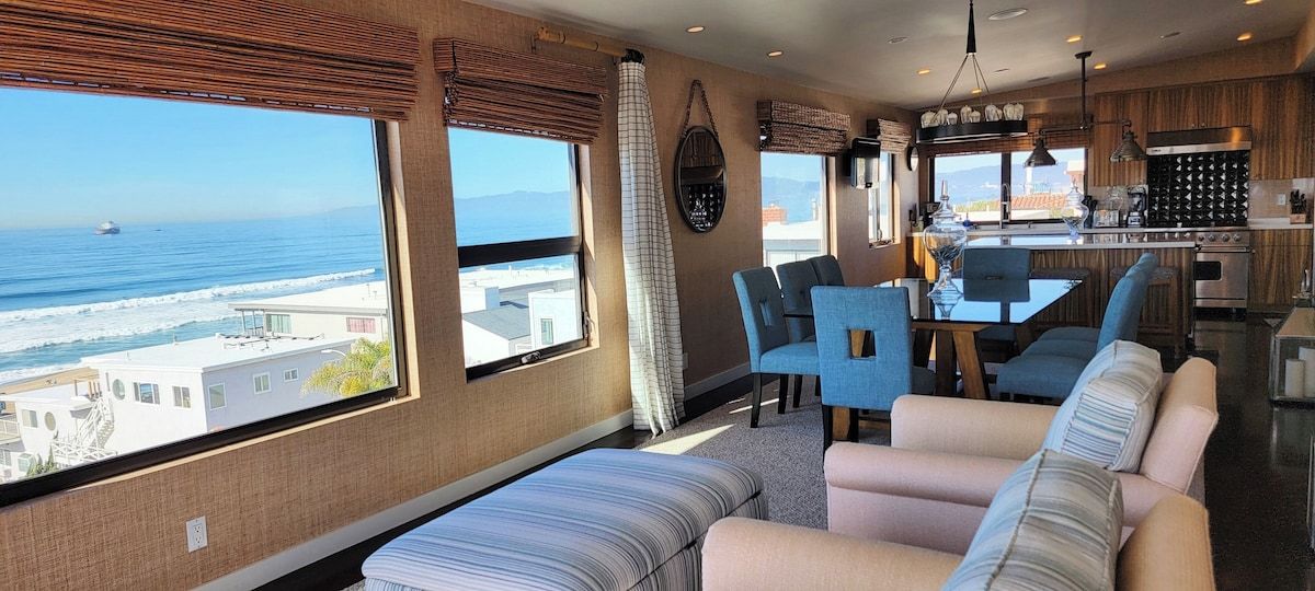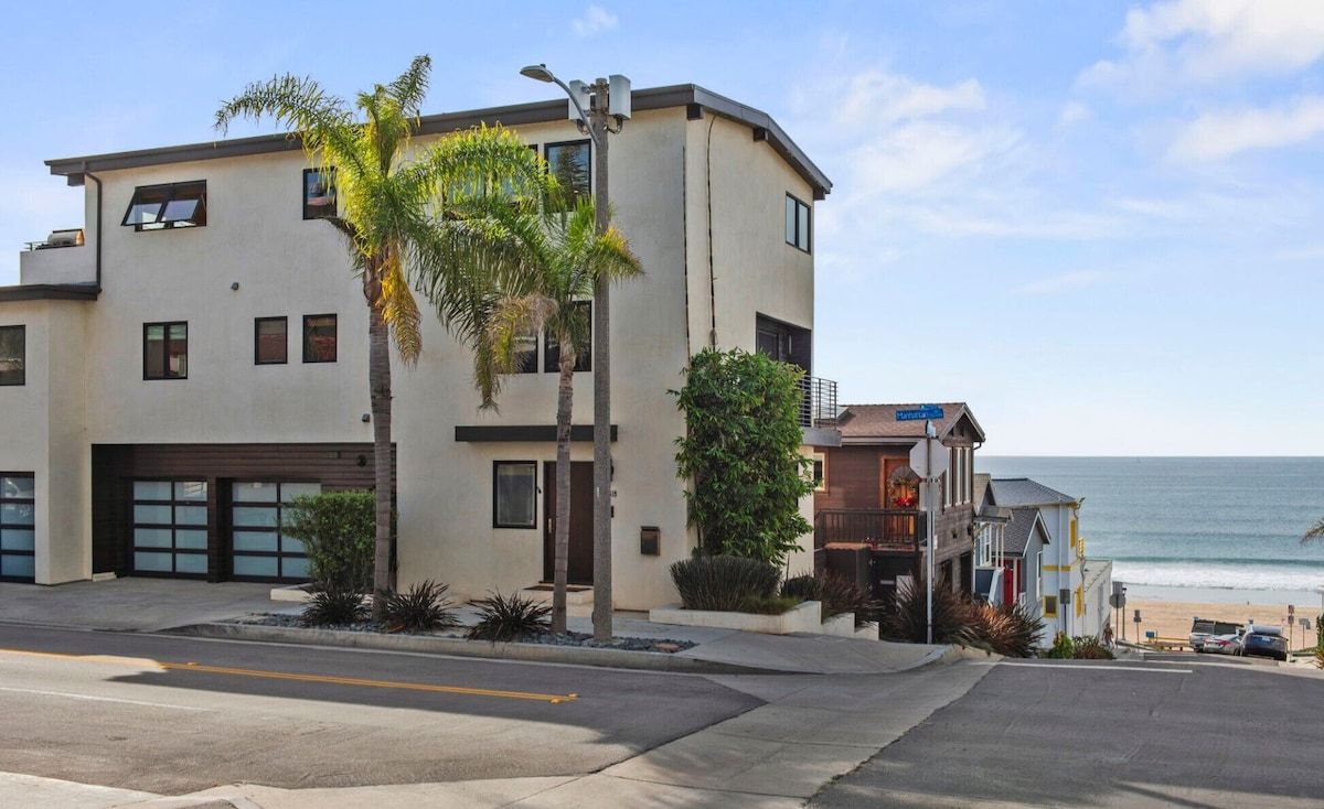 Fabulous 4-bedroom 3.5 bath home just two blocks from the Manhattan Beach Strand. Expansive white water sunset views from Manhattan Beach to Santa Monice to Malibu. 26I0 square foot open floorplan. Newly upgraded, including all new sofas, dining, bedroom and bath upgrades with comfy linens and towels. Fully furnished gourmet kitchen with all the amenities for the fussiest cook. ADA accessible with an elevator serving all 3 levels and garage ramp access. Two Master Bedroom Suites! First entry level includes a large master bedroom/sitting room office suite with direct access to a private 2 car garage and 220EV for electric car charging. This Master Suite has a comfy queen sleeper plus the King and can sleep 4. The ocean views begin on the 2nd level with a primary master suite with en-suite bathroom with large dual head walkin shower. 2 additional bedrooms on 2nd level with full bath. Guestroom with a queen bed and another with a 2 twin trundle bed that can convert to a queen. Plus a large separate laundry room is also on this level. Spectacular ocean views are on the 3rd level that features an open concept kitchen with a large serving island, stainless steel appliances, a separate dining area and living room and sitting area - perfect for entertaining or just relaxing enjoying panoramic ocean white water views. Family/Media Room has a comfy pull out queen sleeper and powder room. AC and Hi Speed Wi-Fi is active throughout the house, Smart TVs are in all the rooms, An EV charging station is in the garage. All of this is conveniently located near local restaurants, shops and downtown Manhattan Beach. License #27107807