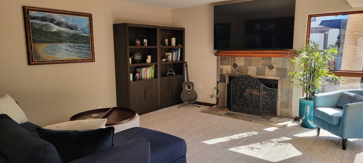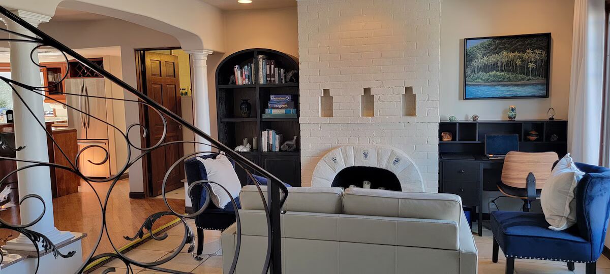 Enter into this beautiful two story home thru the living/reading/office room and proceed forward thru the kitchen/dining open design and into a spacious family room with comfy queen sleeper sofa, 75 inch high speed WIFI Smart TV.